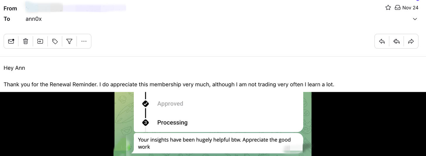 After four months, I am happy to report that members have been satisfied.Members are extending, with several ones even buying yearly subscriptions.I also got kind words directly on how they appreciate my insight. It really means a lot, guys 🥲.